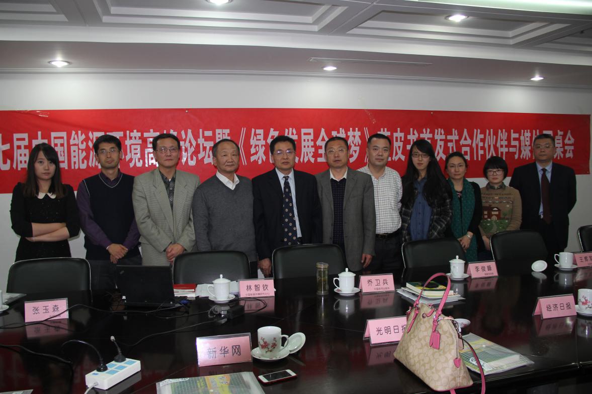 2014年11月4日下午,第七届中国能源环境高峰论坛暨《绿色发展全球梦》蓝皮书首发式合作伙伴与媒体圆桌会在国资委1425会议室召开。会议由中国能源环境研究中心主任、中国能源环境高峰论坛秘书长、对外经济贸易大学教授林智钦主持并发布峰会信息。国家应对气候变化战略研究和国际合作中心主任李俊峰对会议召开高度重视委托主持人转达他的意见。中国经济出版社副总编辑乔卫兵、北京环境交易所常务副总裁王辉军先后代表联合主办方讲话。北京环境交易所节能量交易中心主任张震龙介绍城市灰霾治理与混合动力车分论坛筹备情况。法液空集团北京鲁奇销售总监张晓东、中国经济年鉴社编辑一部主任崔清北、对外经济贸易大学国际经济研究院院长助理蓝庆新、中管院、华威凯德等专家合作伙伴先后发言。光明日报经济部主任记者张翼、经济日报记者陶玙、中国能源报新闻部记者傅玥雯、新华网能源与节能环保部记者李由、央视华人频道编导刘道同、中国汽车报记者姚思宇等媒体专家、记者参加了媒体会并就大会确定的主题和议题进行了提问。